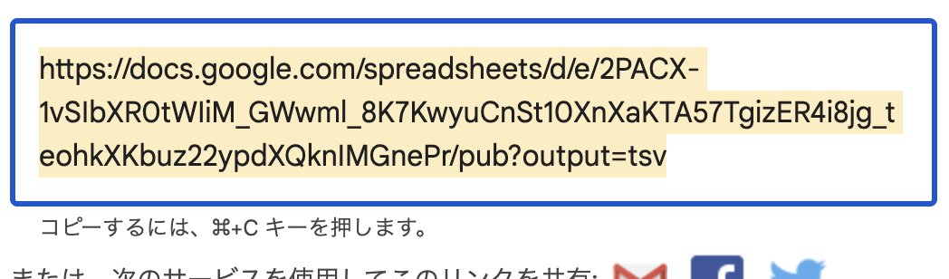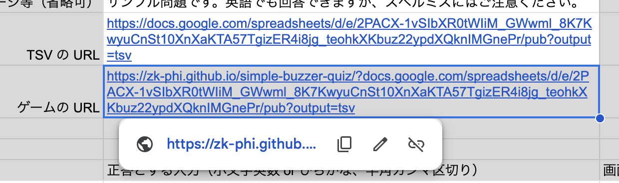 コピーした URL を、シートの「TSV の URL」欄に貼り付けてください。「ゲームの URL」が自動的に発行されます。